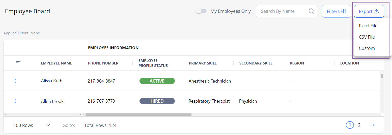 To export information displayed on the Employee Board, select Export at the top of the page and choose the needed format. Hide the imageSee the image.
