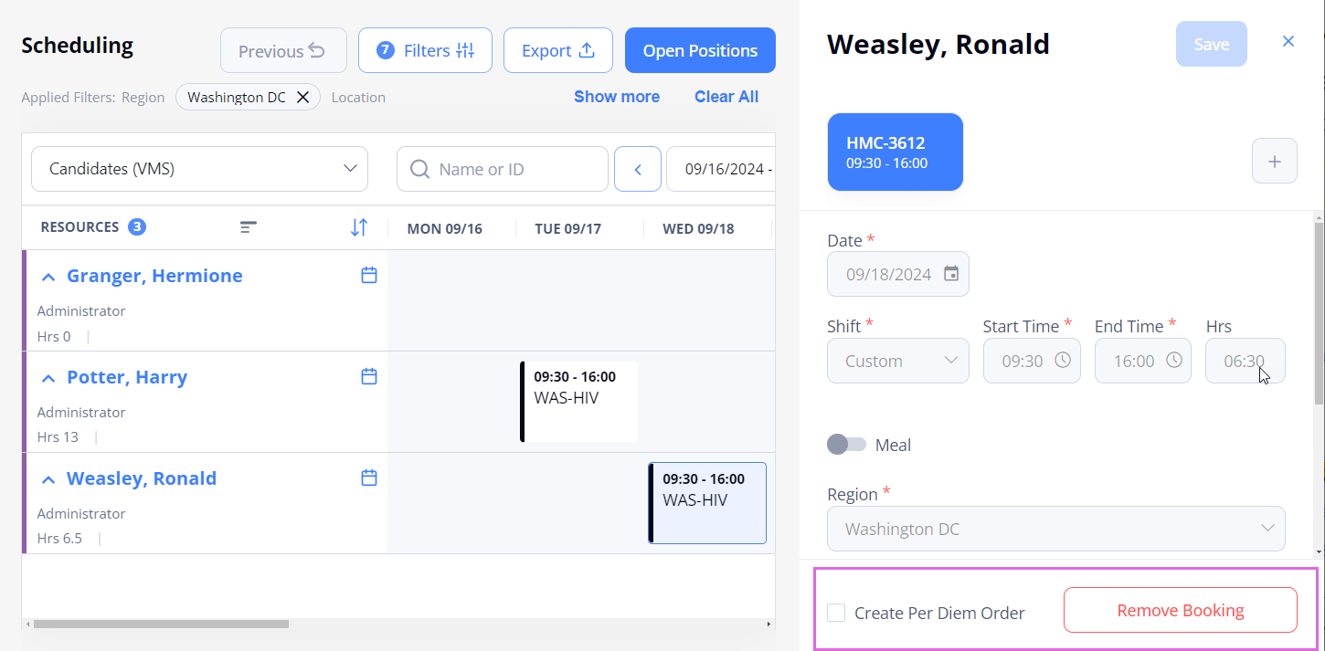 - On Scheduling, filter resources by the region-location-department-skill that matches the Per Diem order the Candidate is applied to; or search by the Candidate's name or ID.